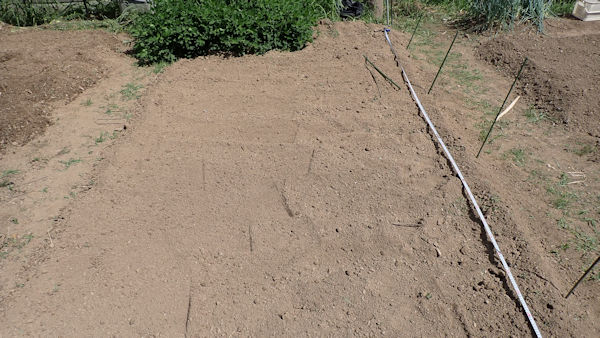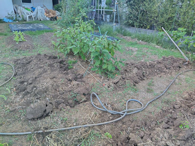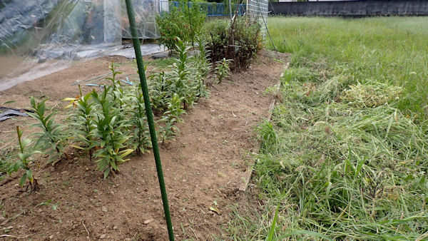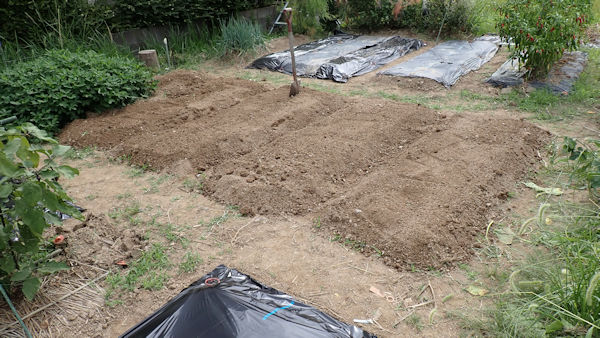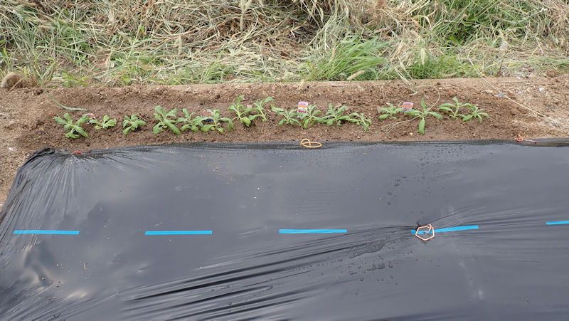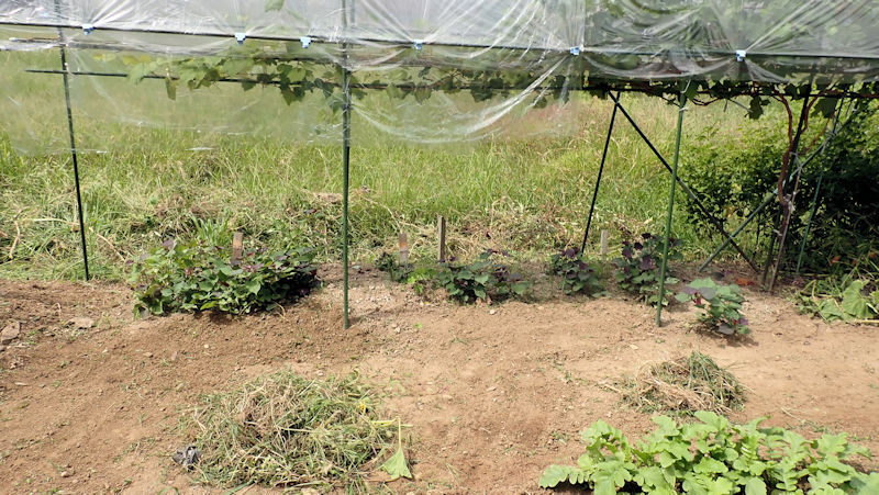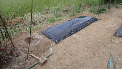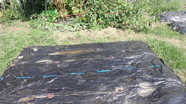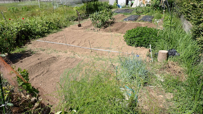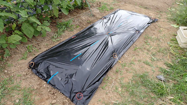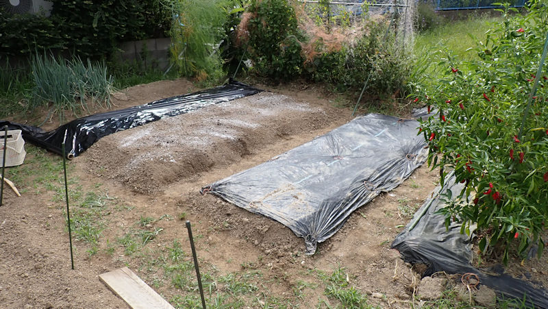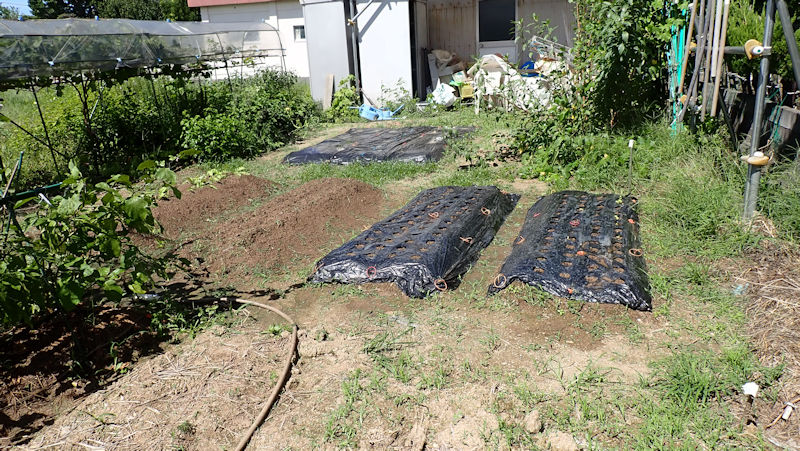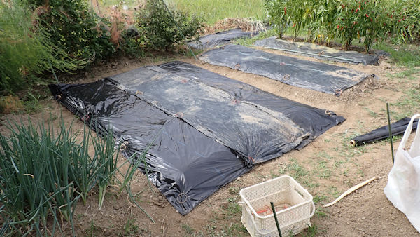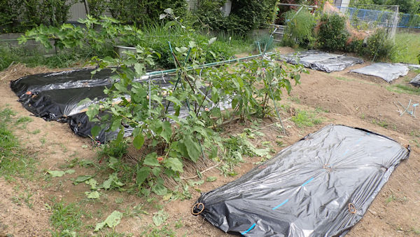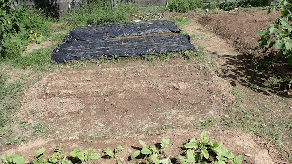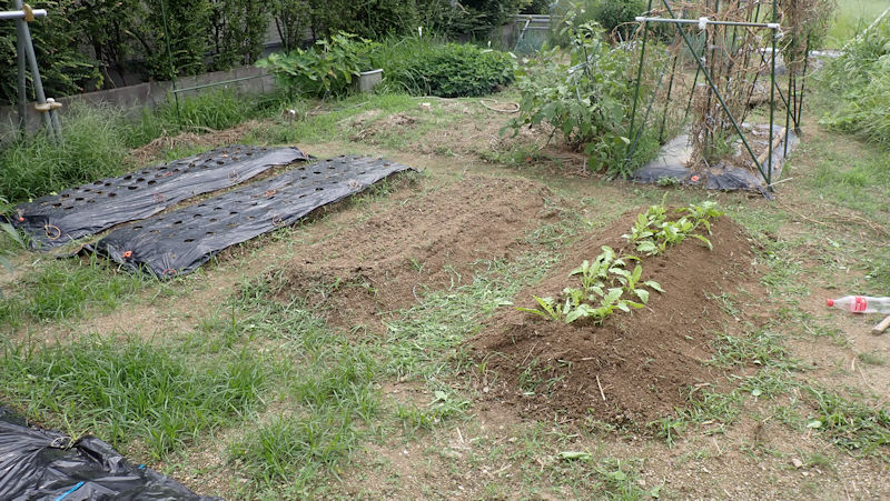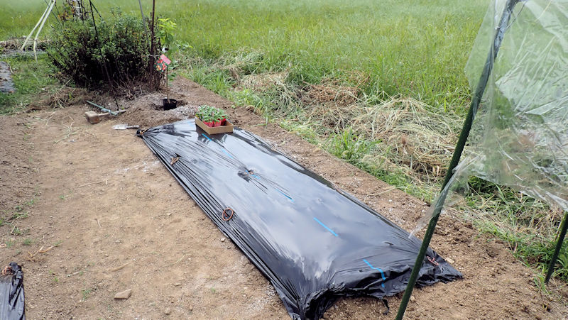 ナスを挟んでこちらの畝は、来週までお休みです。雑草が生えないように、成形してラッピング。 |