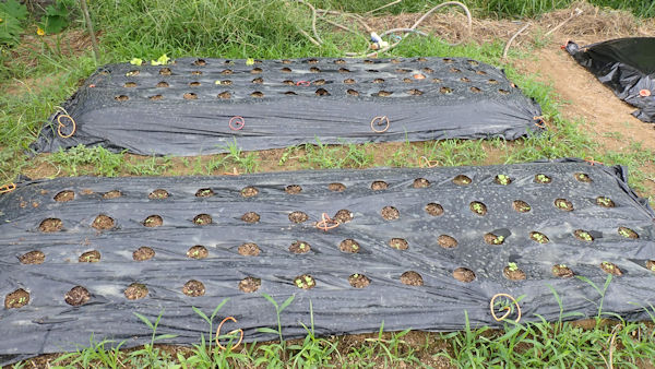 左上は第1ブロック、不織布や黒マルチが第2ブロック