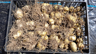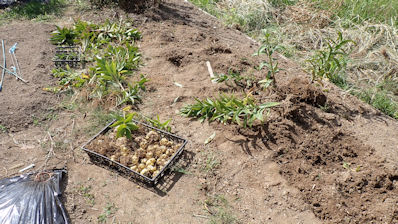 葉が枯れだして収穫期が来ていたのですが、土が固くてスコップが入らない。やっと待っていた雨が来て、今日の収穫です。