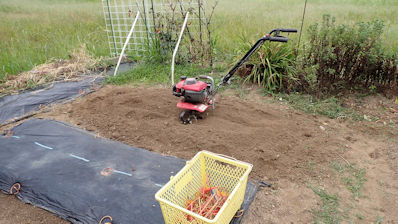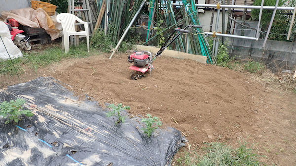 天地返しは済ませてあったのですが、今日は耕運機掛けです。残念ながら、まだ「土が荒くて」何度か雨に当ててから、再度耕運機掛けします。