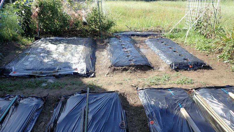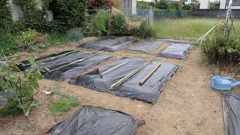 ジャガイモの隣の畝、もう1度耕運機掛けをするつもりでしたが、雨が適度に続いたおかげで、土くれが細かくなっていました。整地だけでして、ラッピングしました。来春は、ジャガイモ部分も併せて「スイカ」の畝になります。