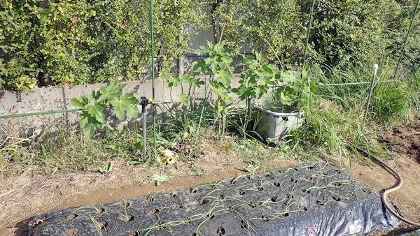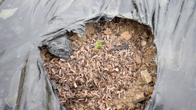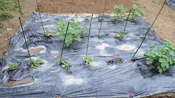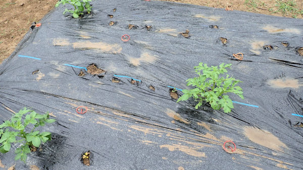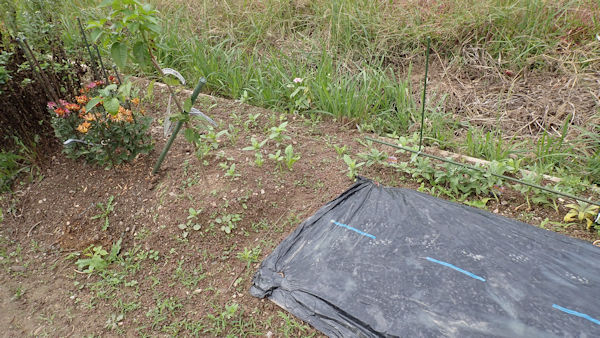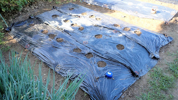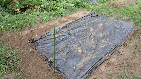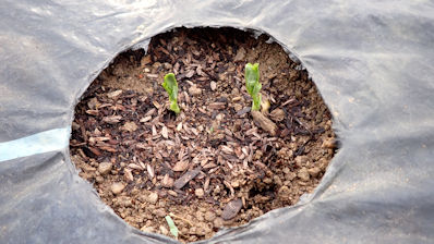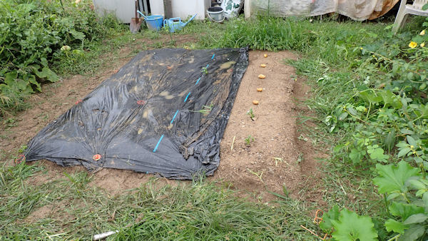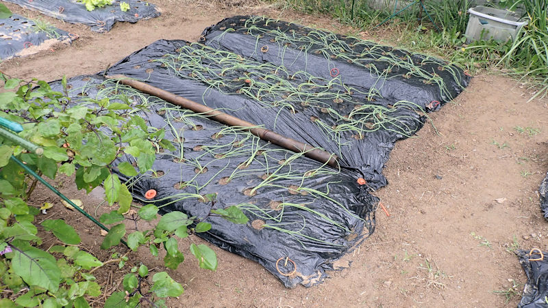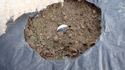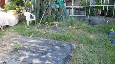 そこで、黒マルチを剥がしてみた。黒マルチの中で発芽が1個あり、これで4個の発芽です。