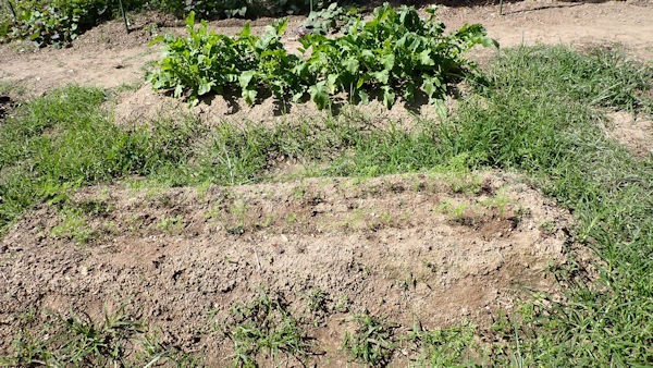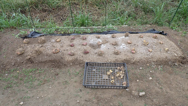 ジャガイモの種芋時期に植えたのですが、やはり「気温が高すぎた」のでしょう。1月遅れの「再植付け」ですが、祈るばかりです。 |