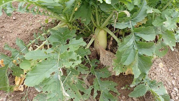 葉物野菜が食害で「ほぼ全滅」ですが、大根は食害を乗り切り、間もなく「収穫サイズ」です。 |
