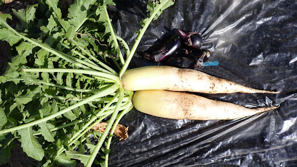 大根と人参は、虫に喰われながらも育っています。 |