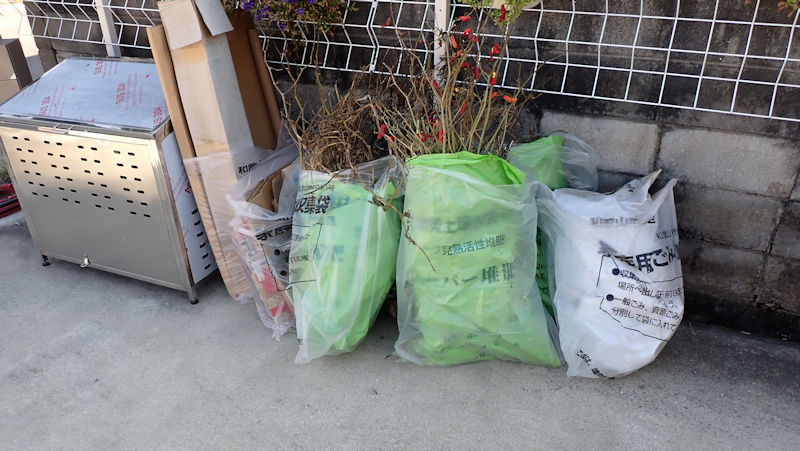 先送りしていた「撤収済作物」の始末です。畑内の3ヶ所に堆積しているのですが、今日はその1っヶ所を袋詰めにして、明日のゴミ出しに間に合わせました(まだ2ヶ所ありますがボチボチ処分していきます)。