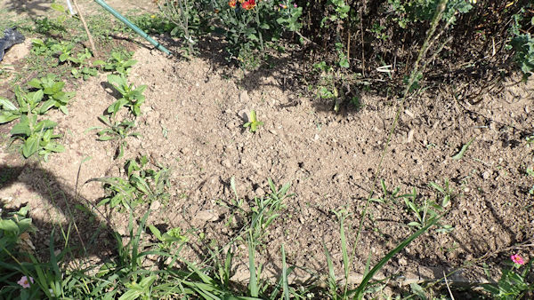 雑草を抜き、バーグを入れて攪拌し、花の種を撒きました。