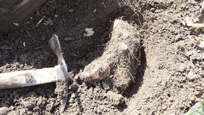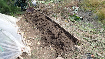 ・収穫が済んだらスコップで天地返し(次回に耕運機掛けしてラッピングします)