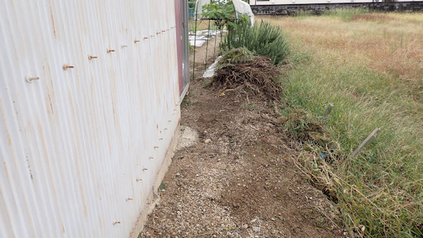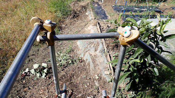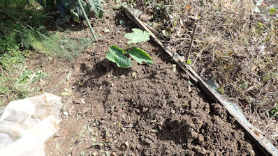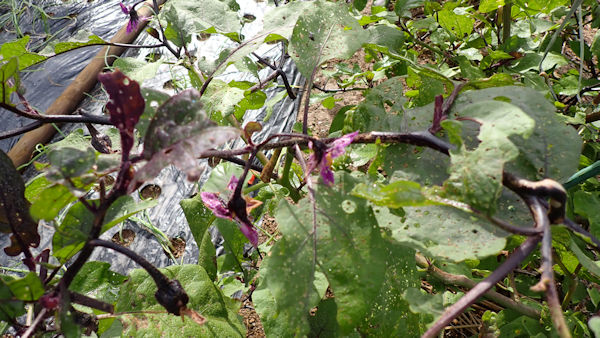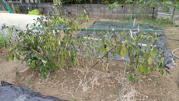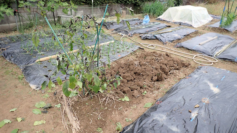 あっけなく枯れだしたナス。まだ「生きるかも」知れない1株は剪定をして残し、3株は撤収です。撤収後は鍬で天地返し。残したナスの行く末次第で、耕運機掛けなどを行っていきます。 |