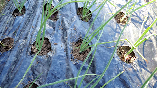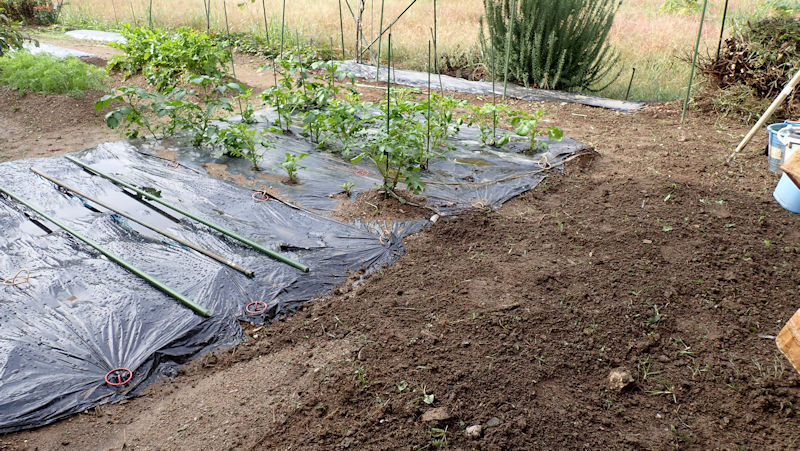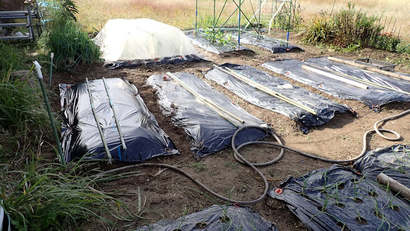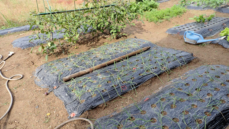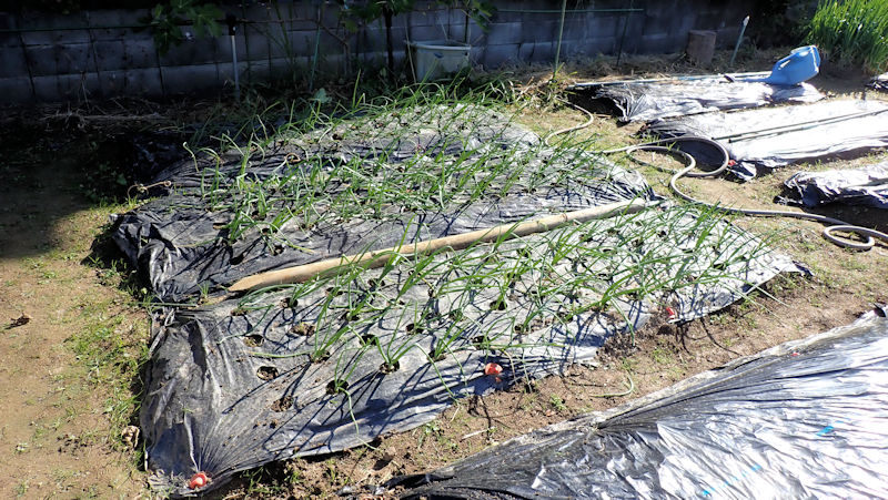 ・ナスの撤収跡。耕運機掛けして整地、その後でラッピング。1株残したナスですが、もう少し長生きしそうです。隣のタマネギも立ってきました。