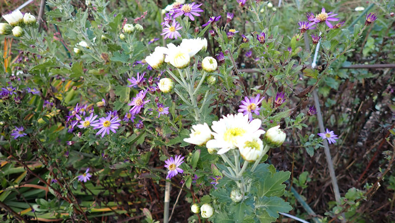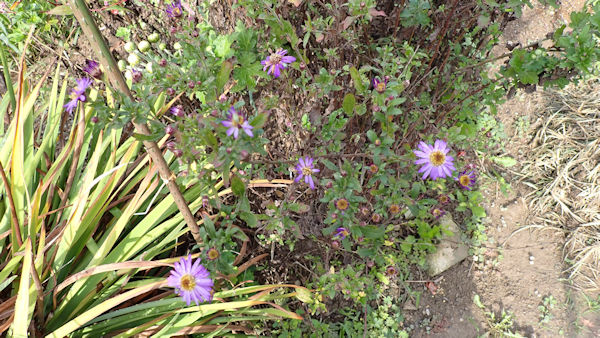 紫のノコンギクに似た菊が咲いています。寒菊も蕾が膨らみだしました。