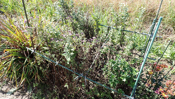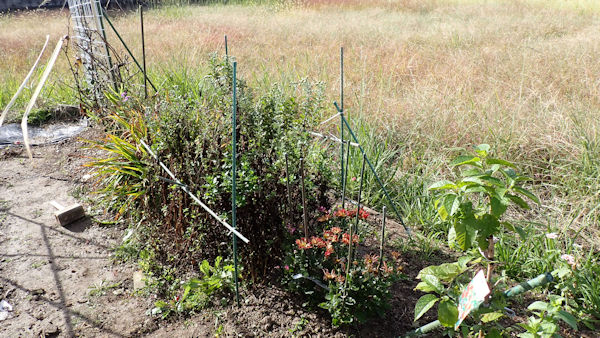 背が高くなってきたので、イボ竹でメッシュ状に仕切りました。これなら強風でも痛手は少ないと思う。