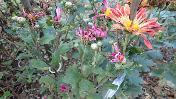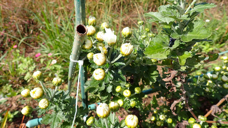 菊は多年草ですが、旧畑から引っ越してきた菊たちは、もう「10年選手」です。そこで、弱ってきた菊を植え替えました。植えた時の花はもう終わりですが、次の蕾を付けています。菊は逞しいですね!