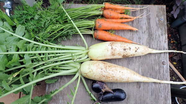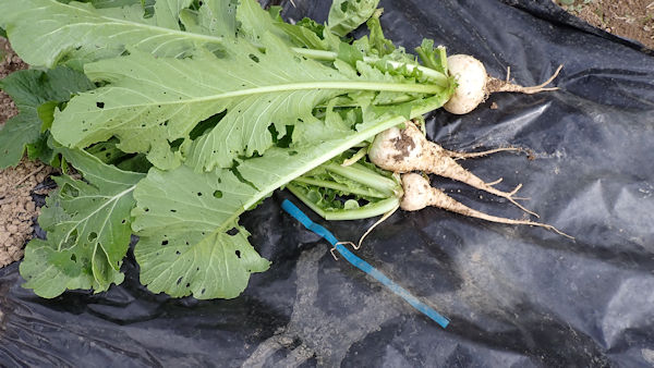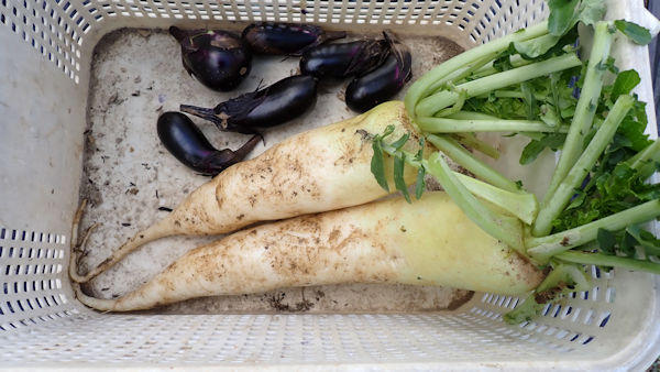家庭菜園用のミニ大根ですが、これだけ育てば充分です。まだ10本以上畑に植わっています。
