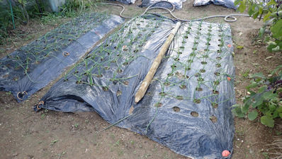 前回は、10p程に育ったのですが、虫害で残ったのは3株だけ。そこで撒き直して、今回の発芽です。虫害にあわないよう、トンネル掛けです。
