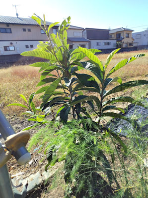 今年の春に「枝を誘引」しようとして、大きな枝2本が折れてしまった。お陰で「株立ちの枇杷」になり、根元から枝分かれになり、いまで1.5mほどになった。花はつけていないので来年の収穫はない。早くても「2年後が初収穫」になりそう。でも、食べられる枇杷なのか?それとも「イヌビワ」なのか分からない。