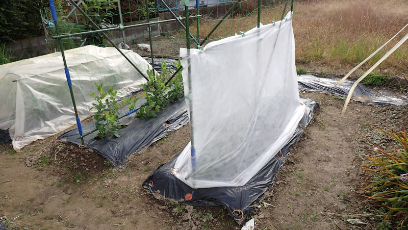 成長がイマイチの「スナップエンドウ」です。寒さに強くもないし、これから降霜も出てくるので、不織布で覆いを掛けました。