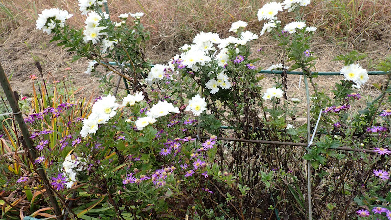 菊、ユリ、スイセン、花菖蒲、ブラックベリー、それに1年草ですが種で復活している矢車草や百日草も、旧MY畑からです。 |