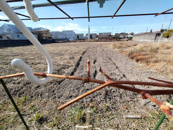 260107(水) 晴れ 野鳥荘へ行く途中で、ブドウ棚を見学。私の「参考書」です。 主軸を残し、脇枝を見事に剪定していました。私の倣って、剪定です!
